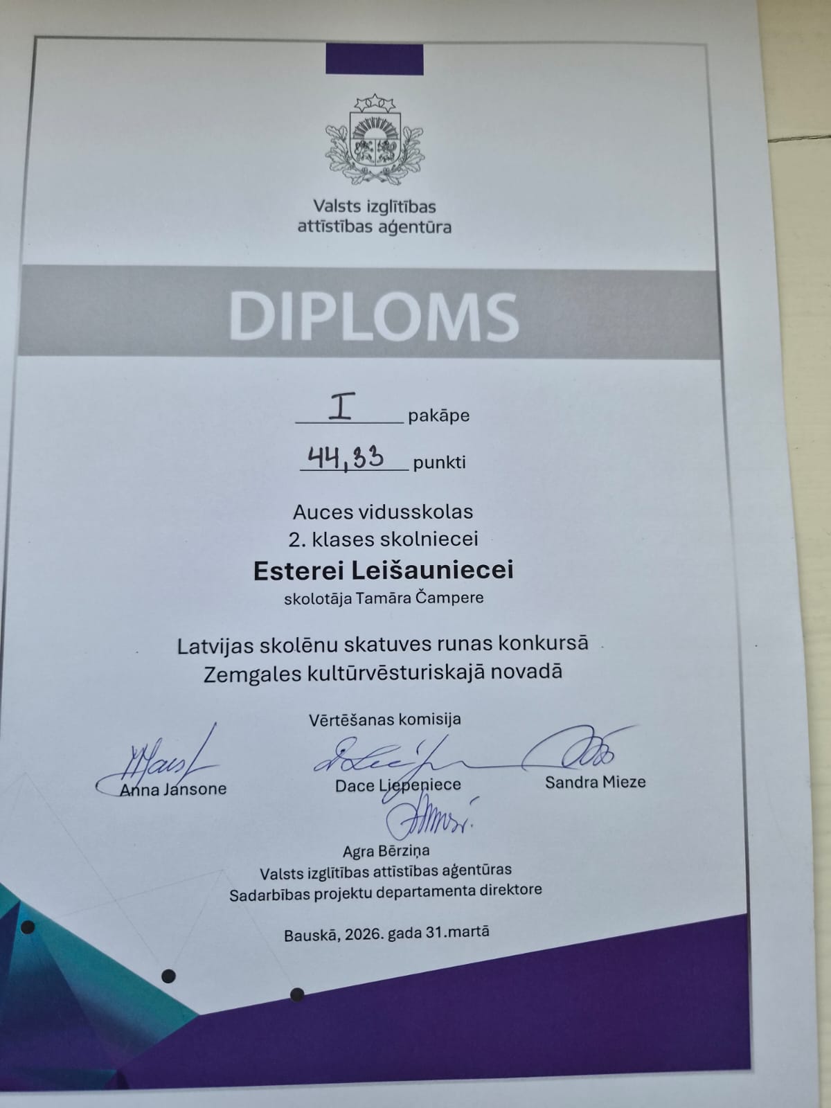 31.03. 2.b klases skolniece Estere Leišauniece piedalījās Latvijas skolēnu skatuves runas konkursā Zemgales kultūrvēsturiskajā novadā Bauskā !