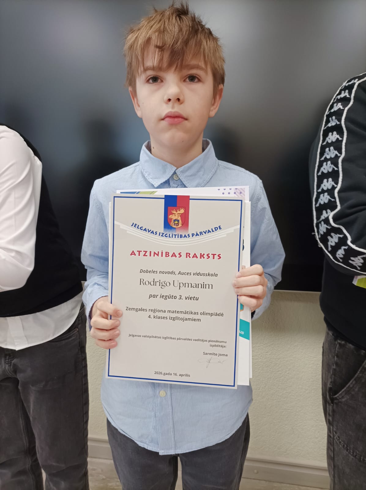 16. aprīlī 4. klašu skolēni Enija Jerčevska un Rodrigo Upmanis piedalījās reģionālajā matemātikas olimpiādē Jelgavā. Pēc darbu nodošanas devās uz Jelgavas tehnoloģiju vidusskolu, kur piedalījās astronomijas nodarbībā, atkārtoja reizrēķinu uz līdzsvara dēļa un progammēja vabolītes. Pēc tam devās ekskursijā pa vecpilsētu.