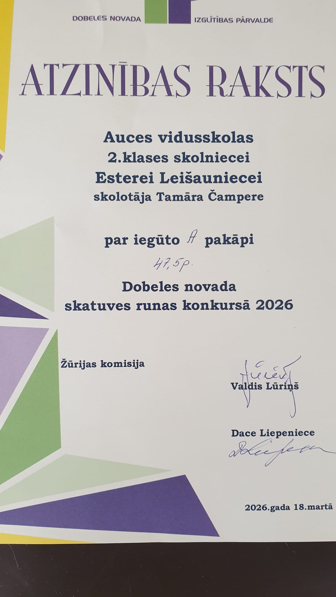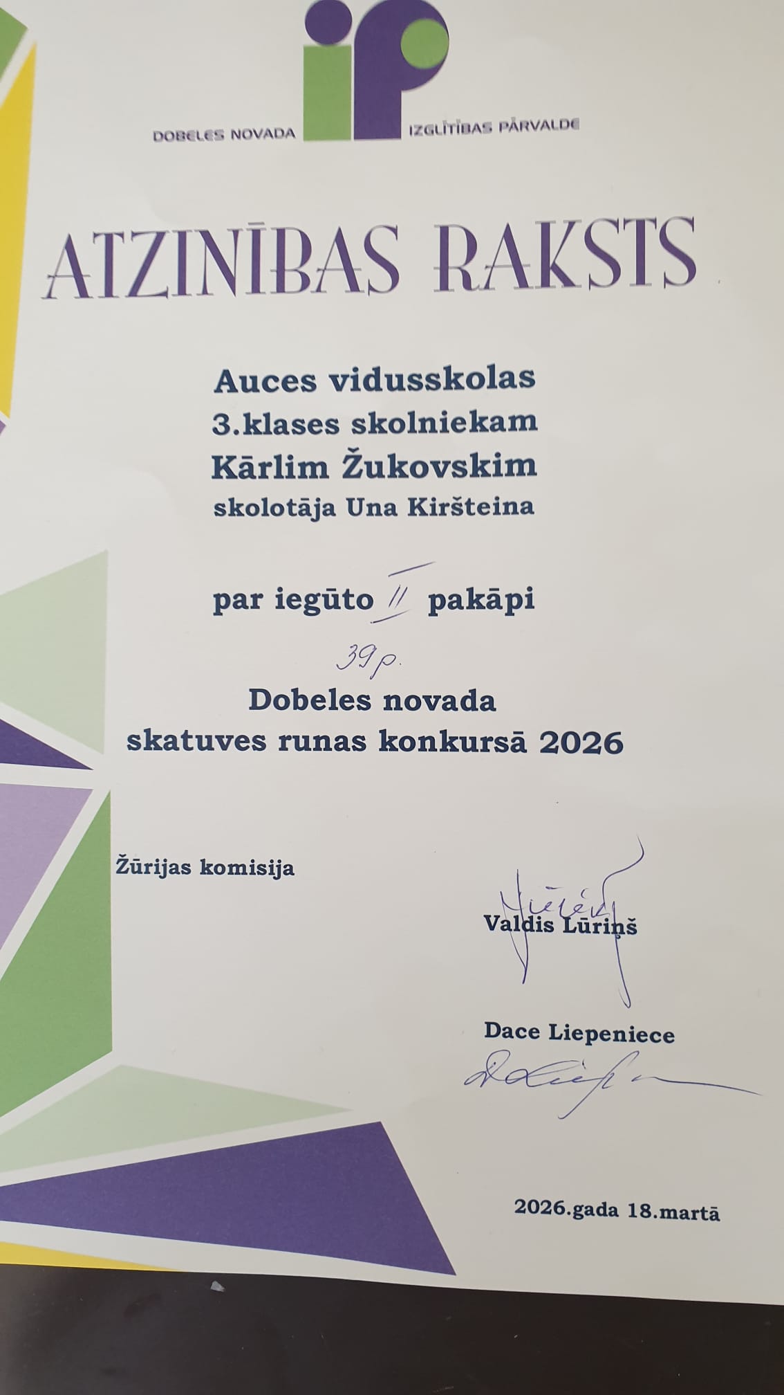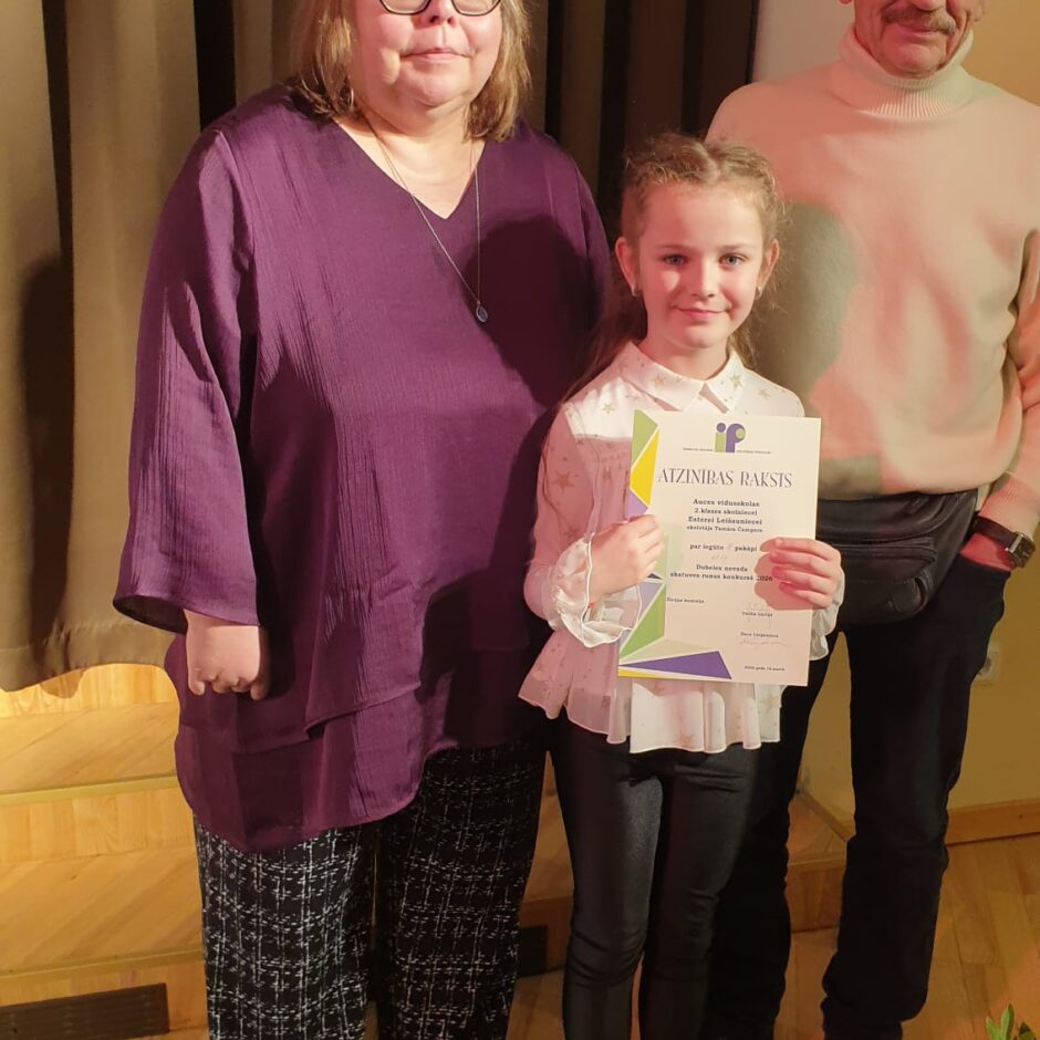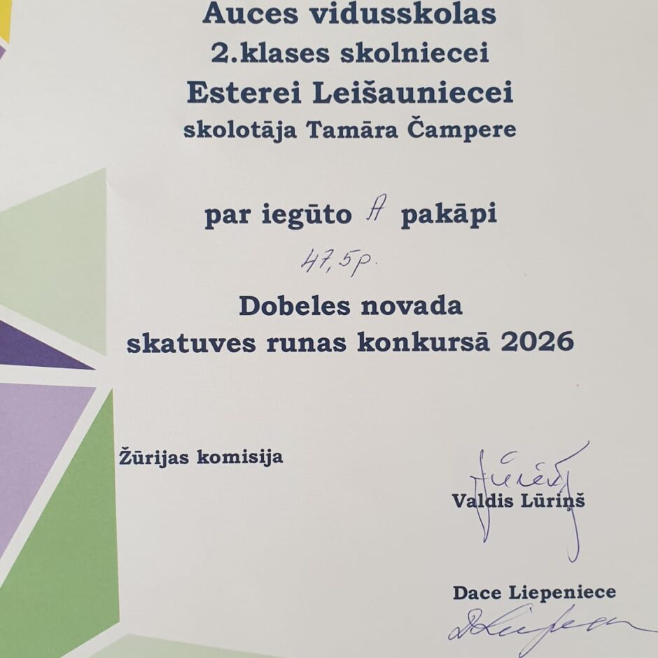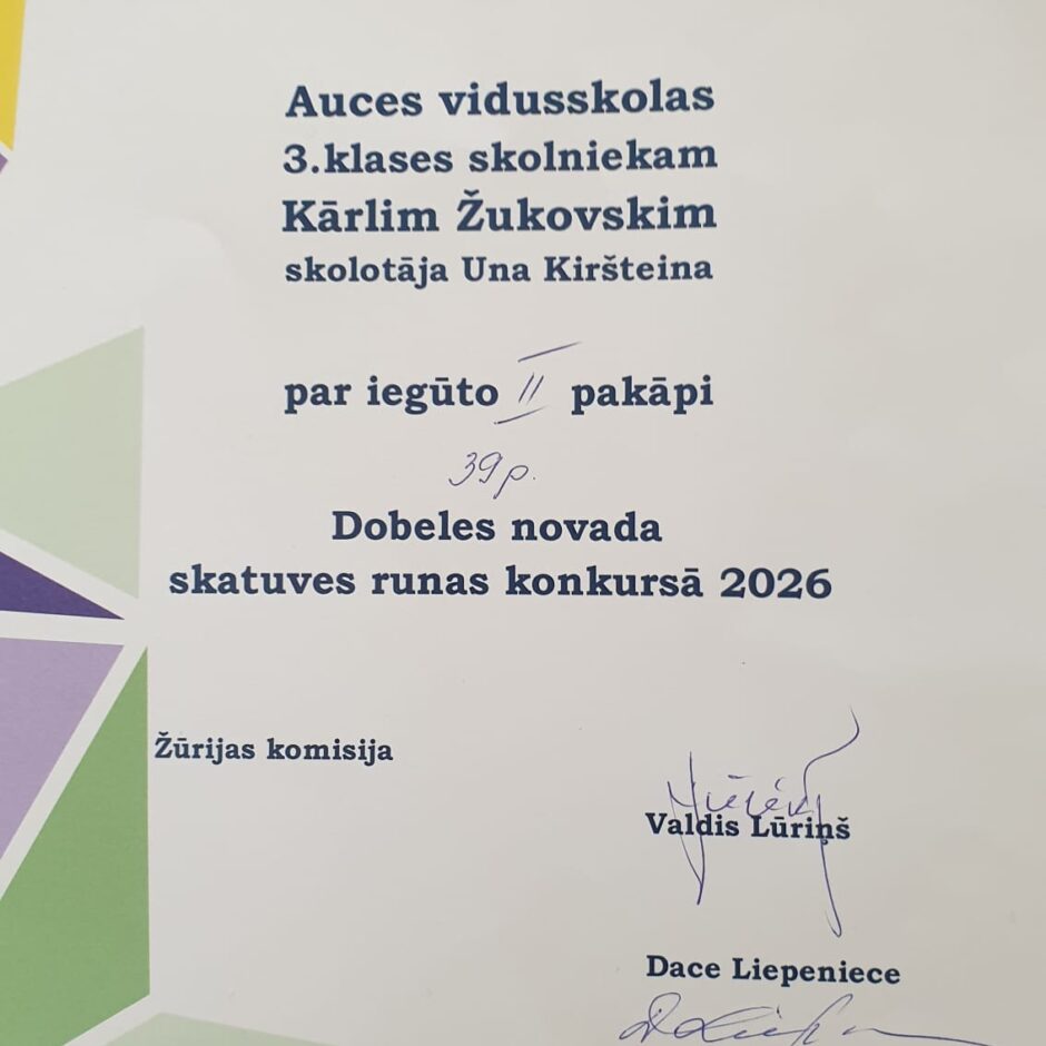 18.03.Dobeles novada skatuves runas konkursā piedalījās 2.b klases skolniece Estere Leišauniece un 3.b klases skolnieks Kārlis Žukovskis.