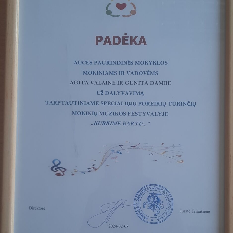 08.02.2024. 4.d, 2.f, 5.f, 8.f, 9.f klašu skolēni skolotājas Agitas Valaines vadībā piedalījās starptautiskā mūzikas festivālā skolēniem ar speciālām vajadzībām “Kurkime kartu…” Lietuvā, Akmenes pilsētā.